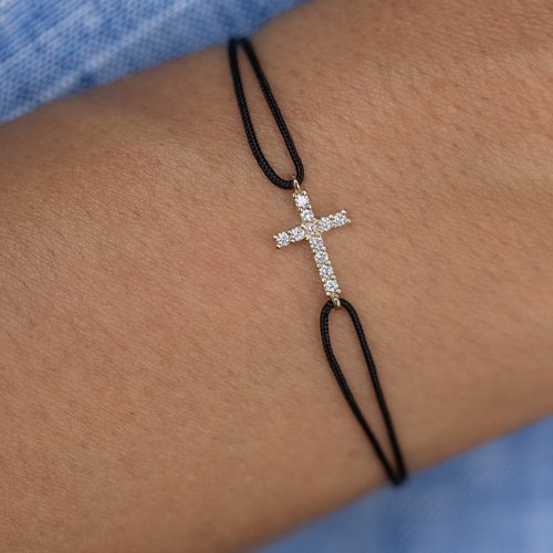 Symbol křížku je po mnohá léta evergreenem a šperk, který je jím ozdobený, by neměl chybět ve vaší šperkovnici. Křížek na tomto náramku tvoří jedenáct briliantů. Délka náramku je nastavitelná. Vybrat si můžete z černé nebo červené šňůrky. Barvu napište prosím do poznámky.