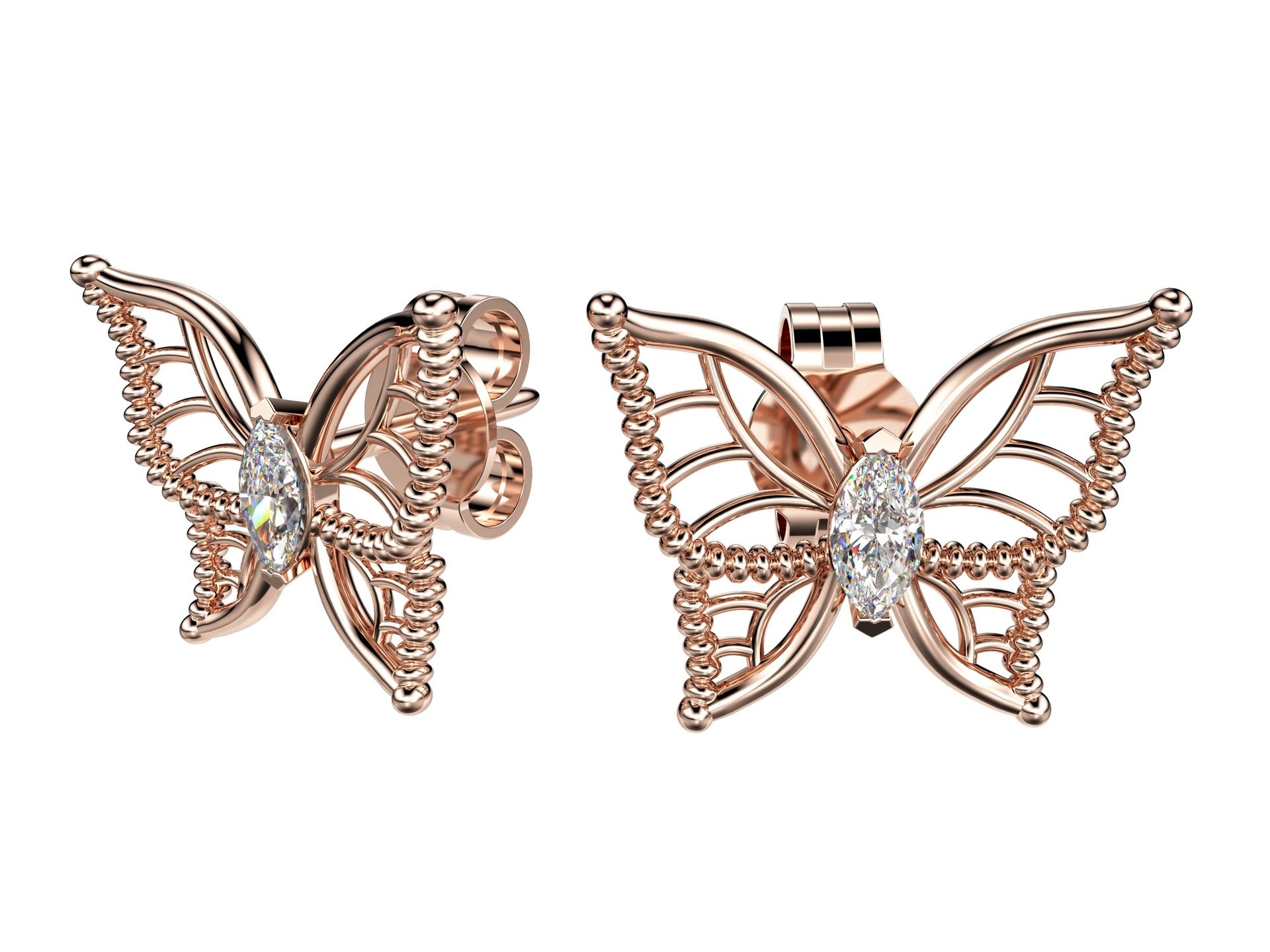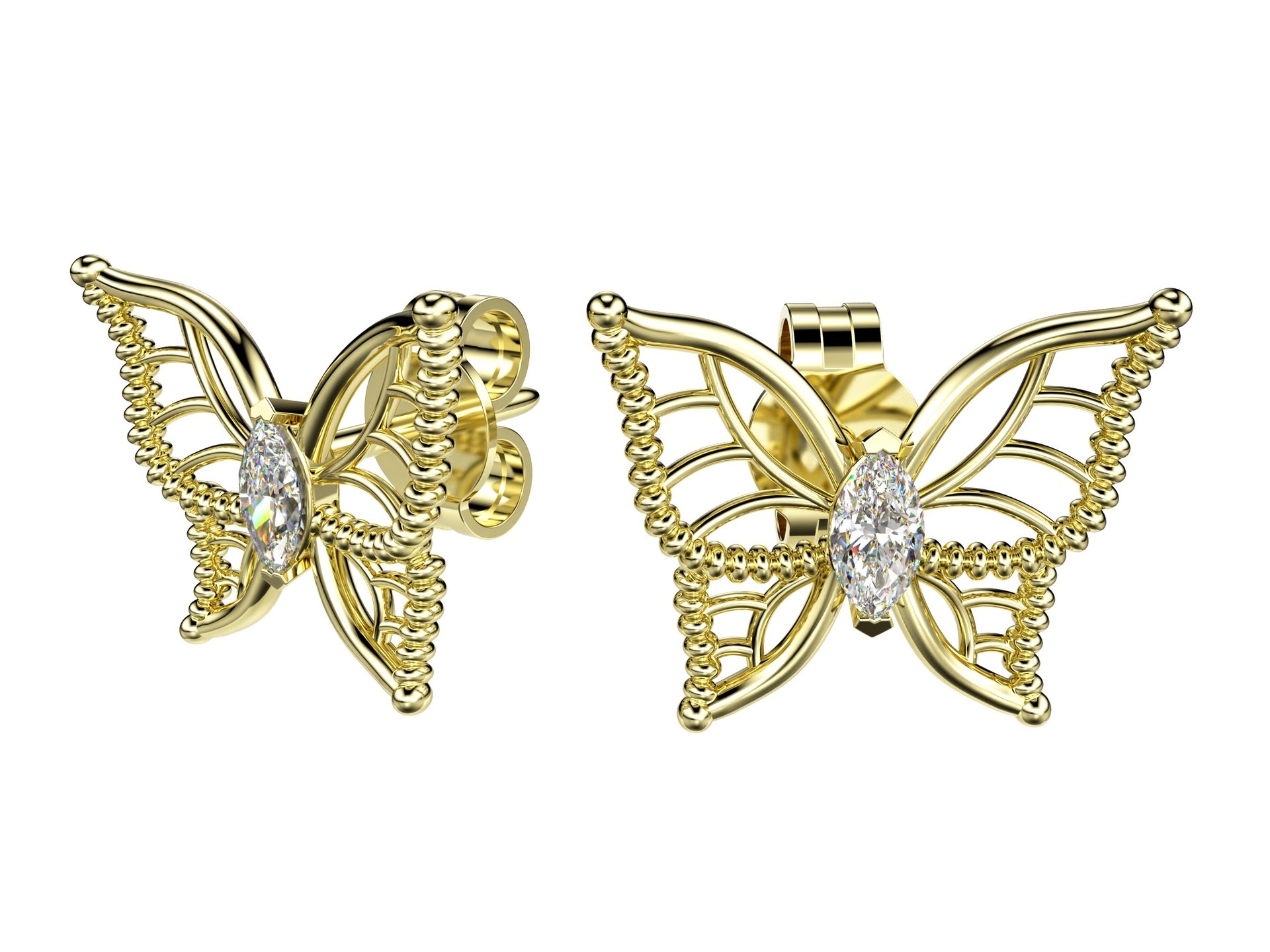 Elegantní náušnice ve tvaru motýlů okouzlí jemnou zlatnickou prací a zářivostí jednoho markýzového diamantu na každé z nich.