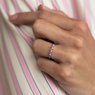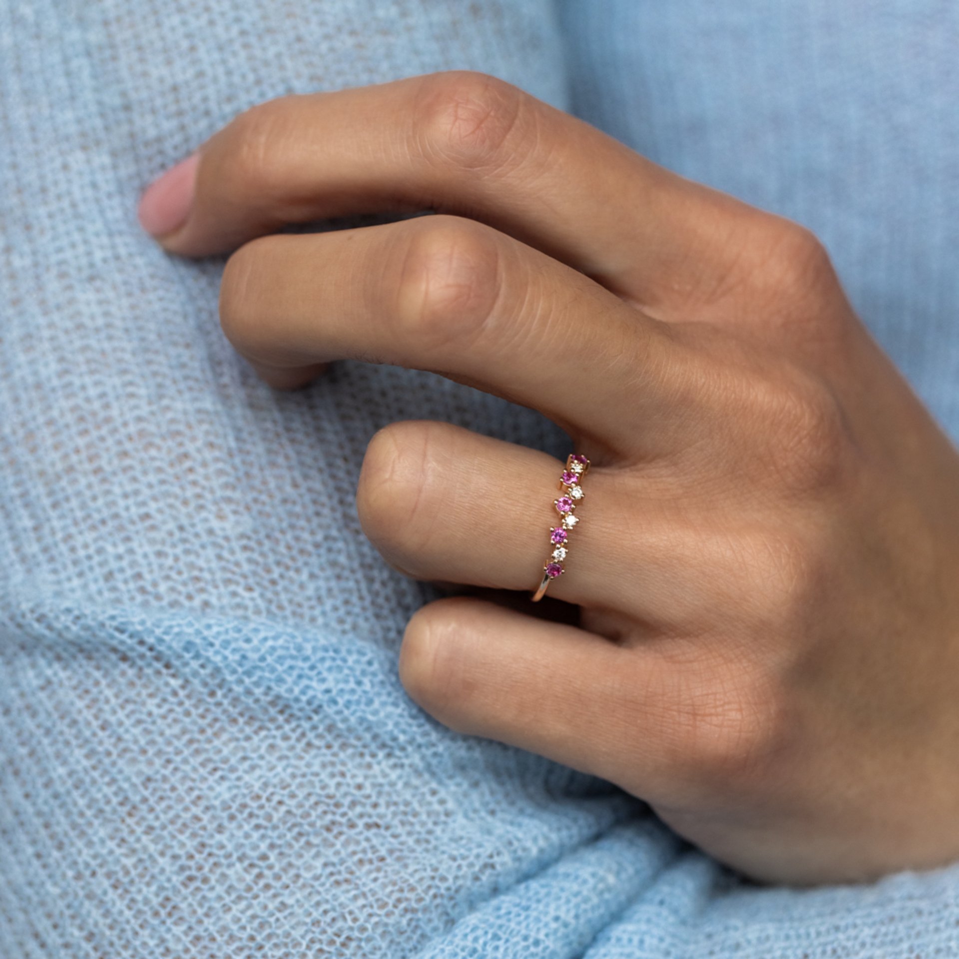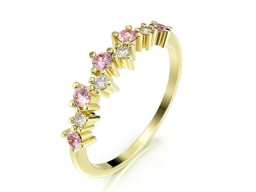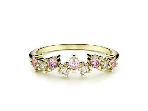 Jemný, hravý a třpytivý je tento prsten, který je osázen brilianty a růžovými safíry. Jakou barvu zlata si vyberete?