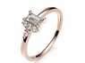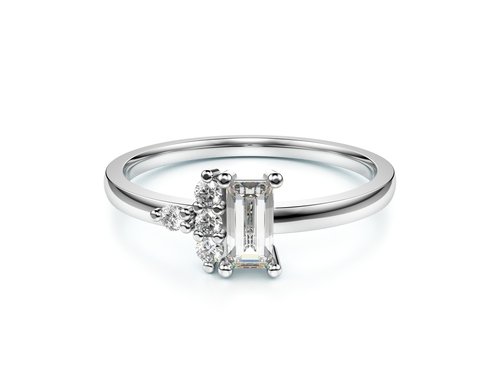 Originální prsten s centrálním diamantem v brusu baguette, který doplňují čtyři drobné brilianty. Výjimečná žena si zaslouží nosit výjimečné šperky.