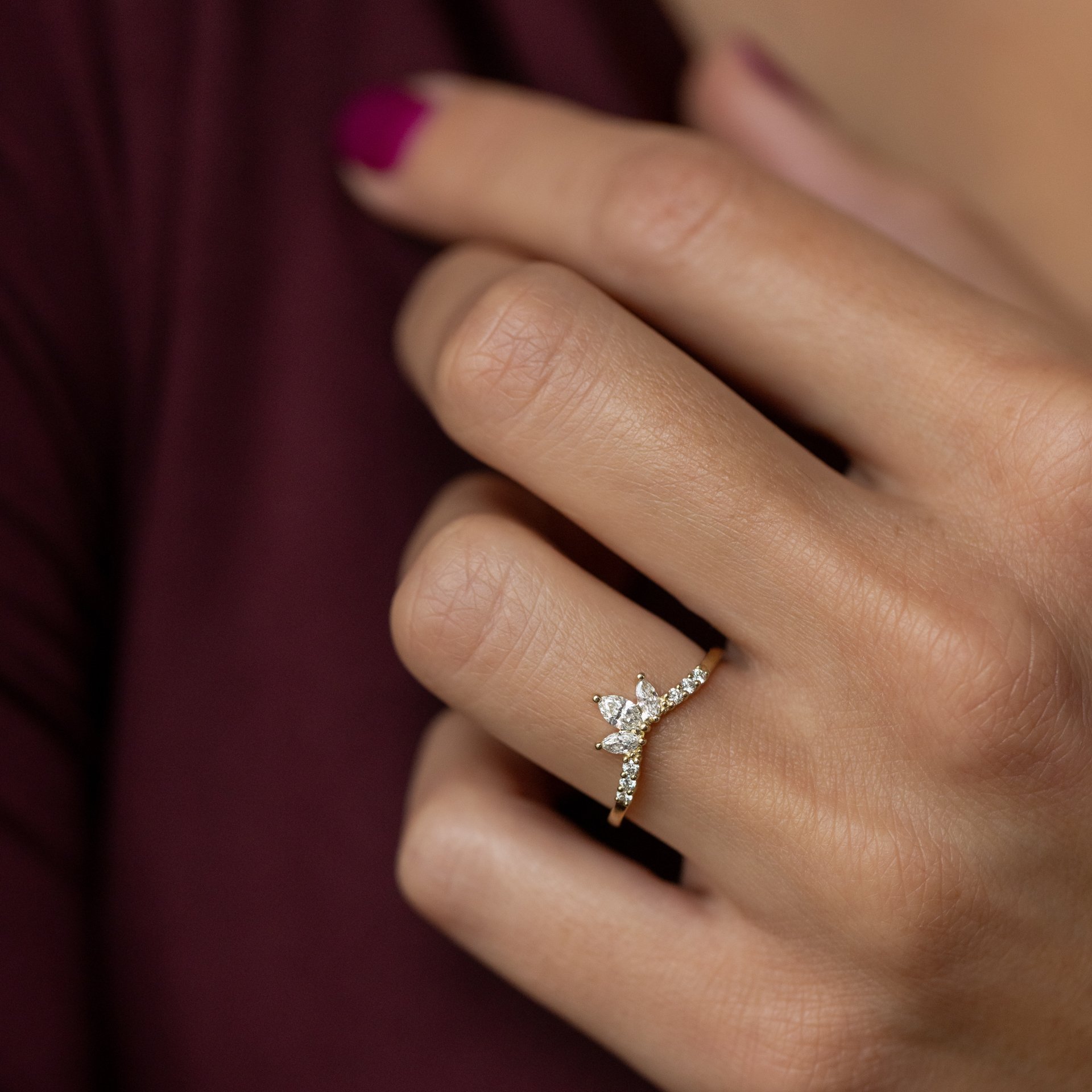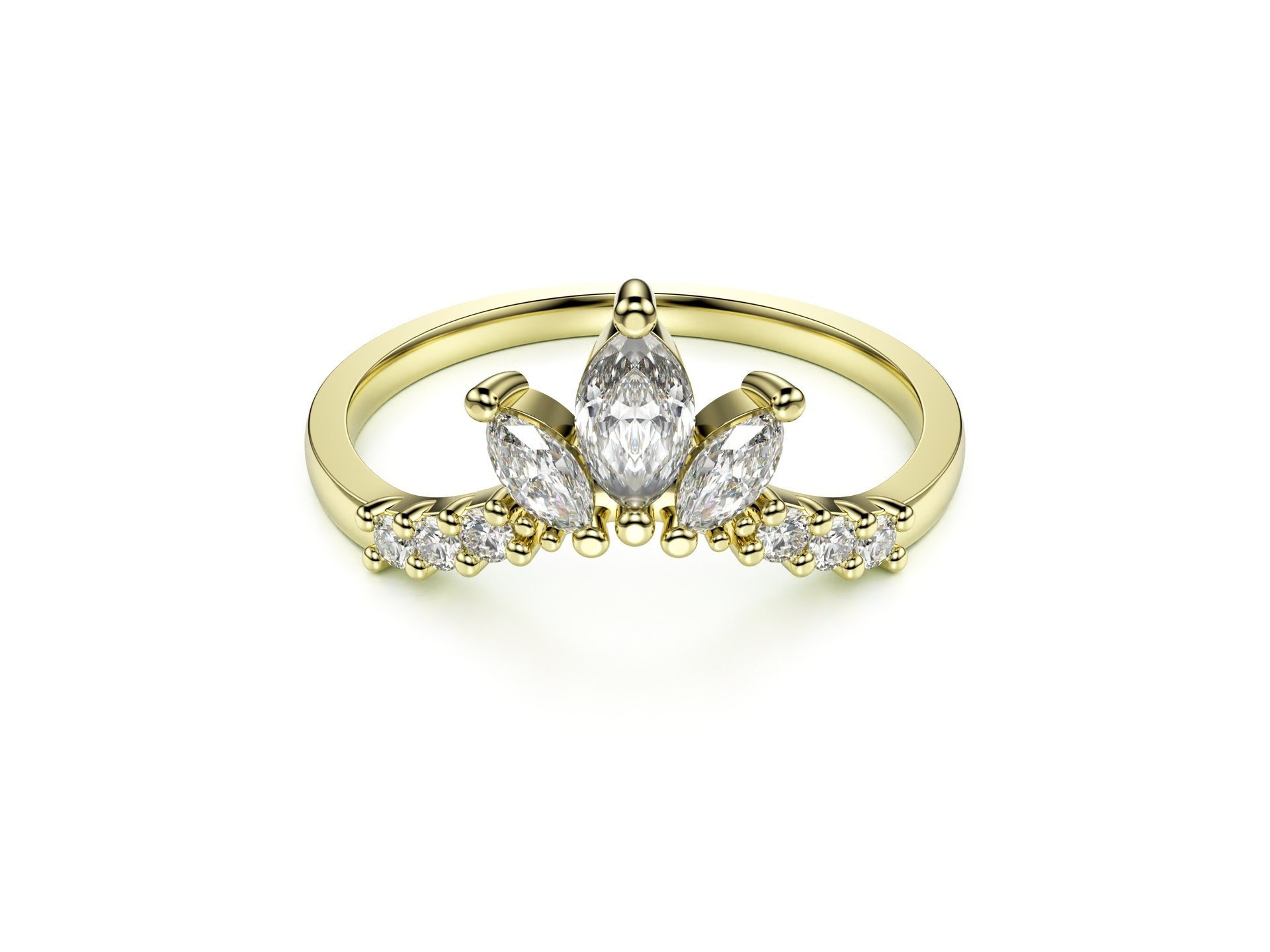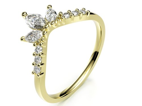 Nebesky krásný je tento zlatý prsten netradičního tvaru obsypaný diamanty v briliantovém a markýzovém brusu.