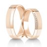 Snubní prsteny, bílé a žluté zlato, rovný profil, celolesk, v jedné třetině tenká drážka, která odděluje barvy zlata na bílý a žlutý proužek, dámský doplněn kamínky, které jsou zafasovány v bílé části prstenu.