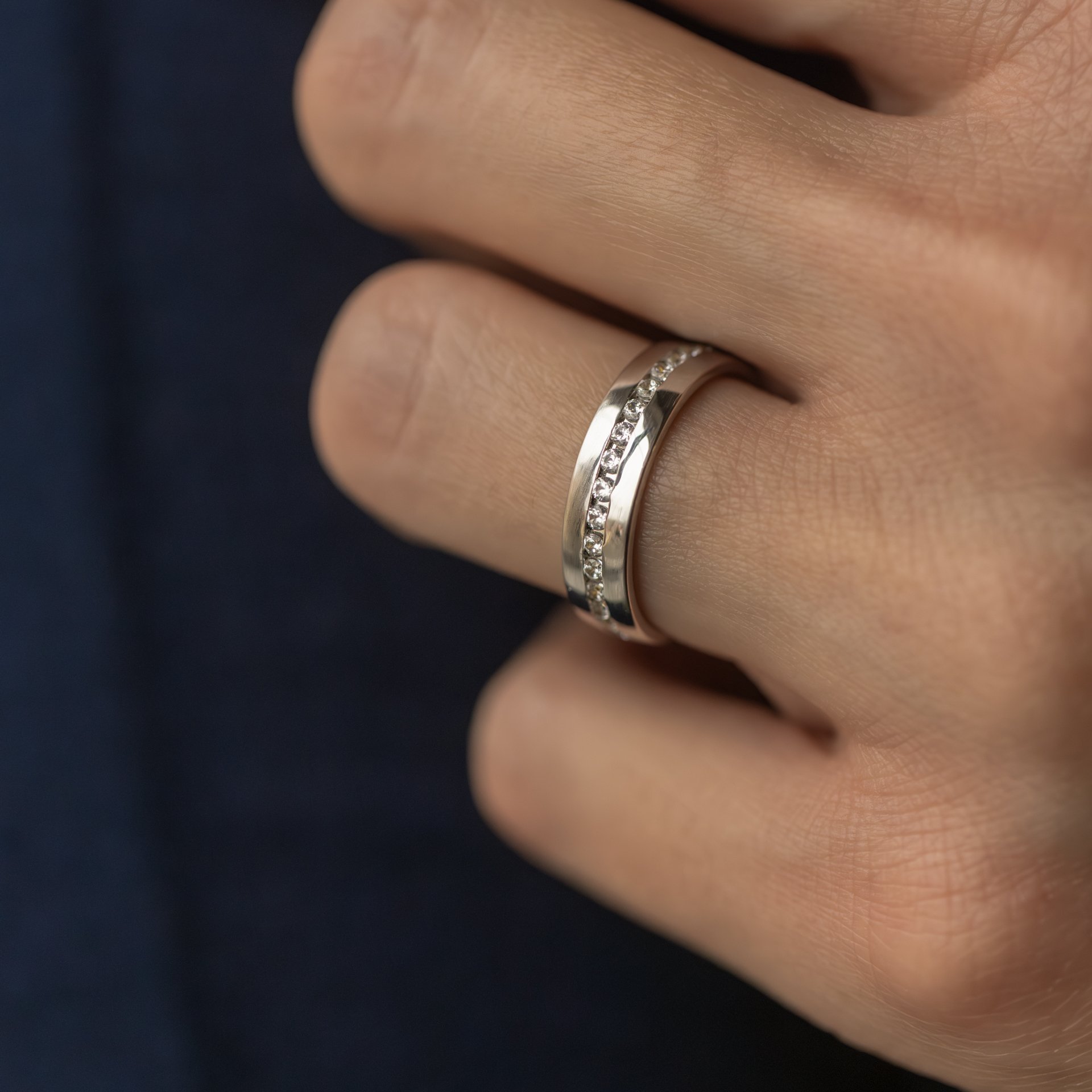 V jednoduchosti je krása. To můžeme říct o tomto modelu, který je celý ve vysokém lesku a má půlkulatý profil. Dámský prsten se honosí středně velkými kamínky fasovanými jeden vedle druhého po celém obvodu prstenu.