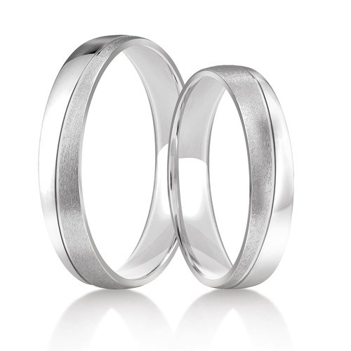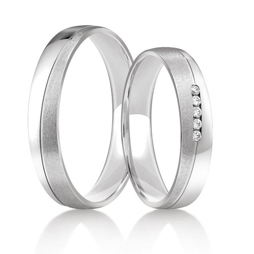Prsteny jež po obvodu doplňuje jemná drážka, která vytváří vlnku a dělí tak kroužek na dvě poloviny. Jedna z nich je ve vysokém lesku, druhá je v diamantově matném provedení. Na dámském je navíc rámeček umístěný na drážce a v něm je fasováno pět menších k