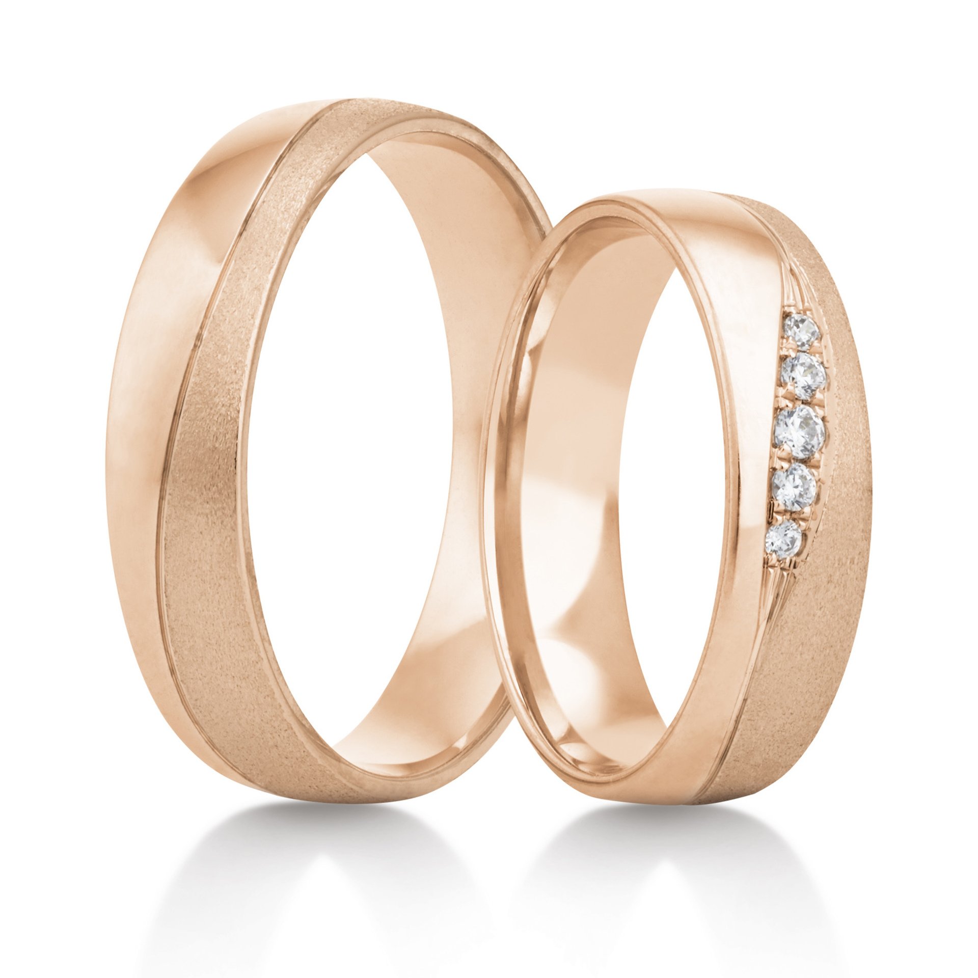 Elegantní linie rozděluje tyto snubní prsteny napříč. Pět třpytivých kamenů je umístěno do drážky dámského prstenu.