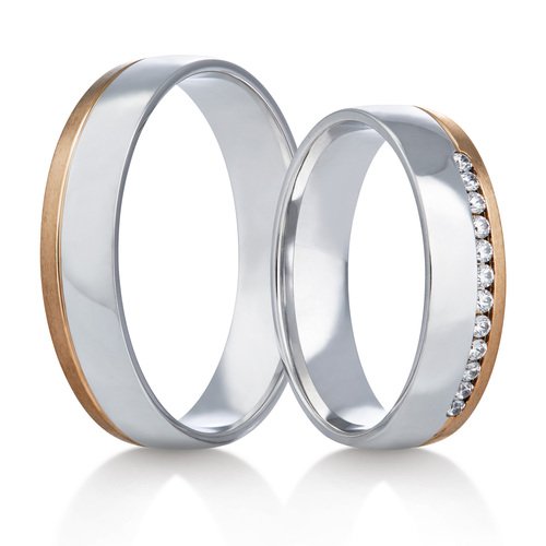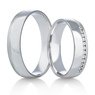 Půvabné snubní prsteny jsou ozvláštněné jemnou drážkou. Dámský prsten je osázen dvanácti kameny, pánský zdobí jemný matný proužek.