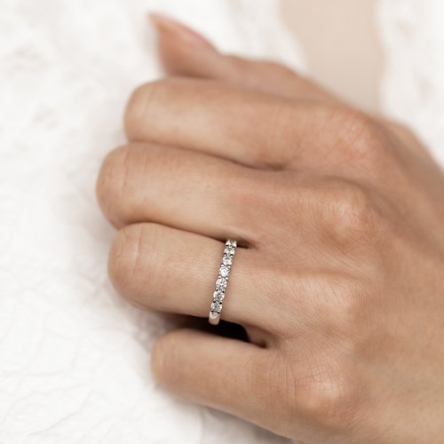 Klasický dámský snubní prsten zdobí 7 briliantů o průměru 2,5 mm. Kamínky jsou usazeny tak, že do nich jde světlo z boku, a proto se budou nádherně třpytit. Pánský prsten je zaoblený jednoduchý kroužek a je o milimetr širší než dámský prsten, tzn. 3,5 mm.