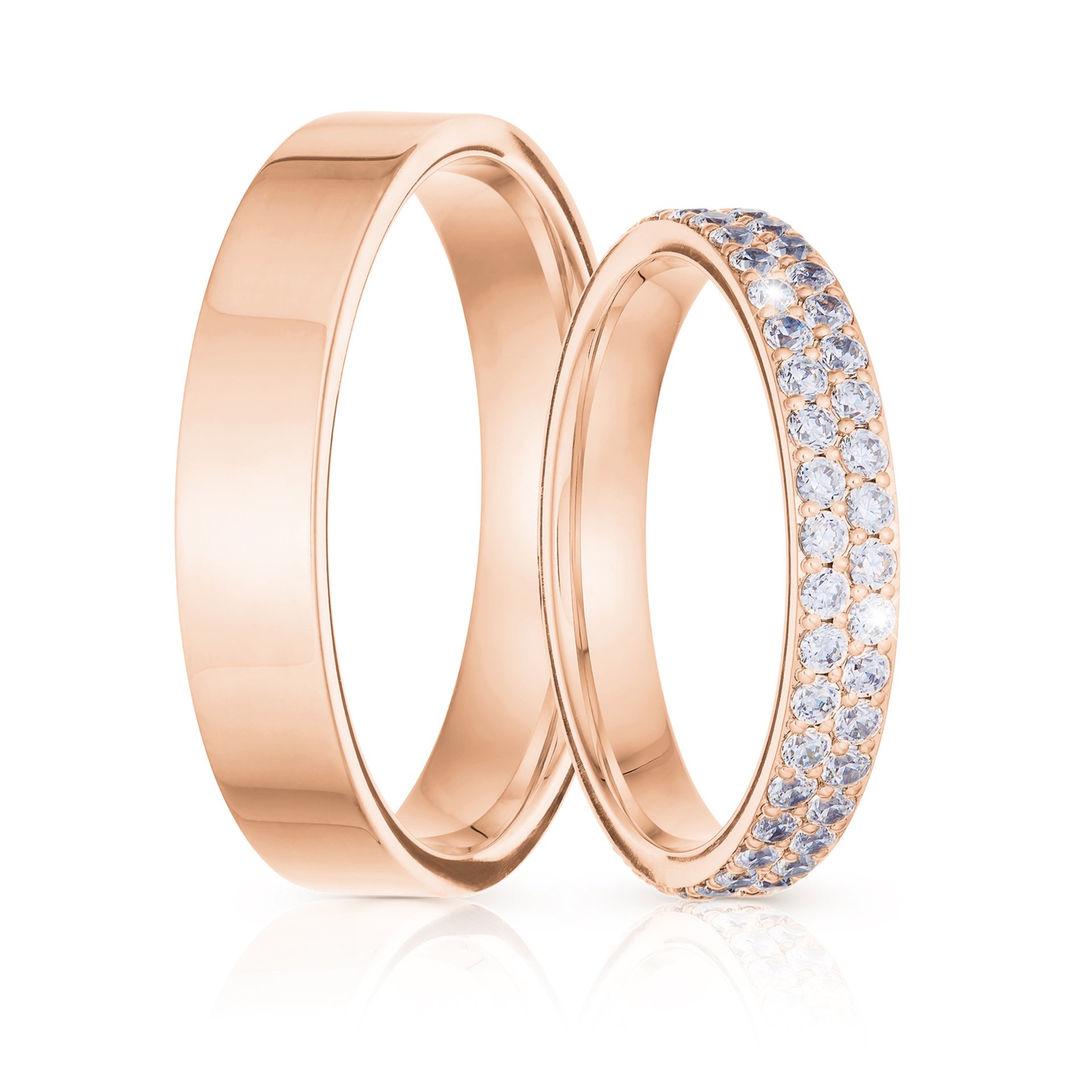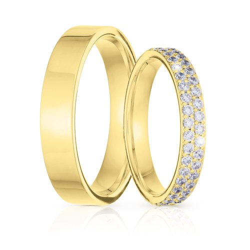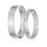 Toužíte po luxusních snubních prstenech, které vám budou dělat radost již napořád? Dámský snubní prsten je po celém obvodu osázen brilianty ve dvou řadách. Doplňuje jej pánský prsten v rovném profilu o šířce 4,5 mm.