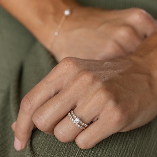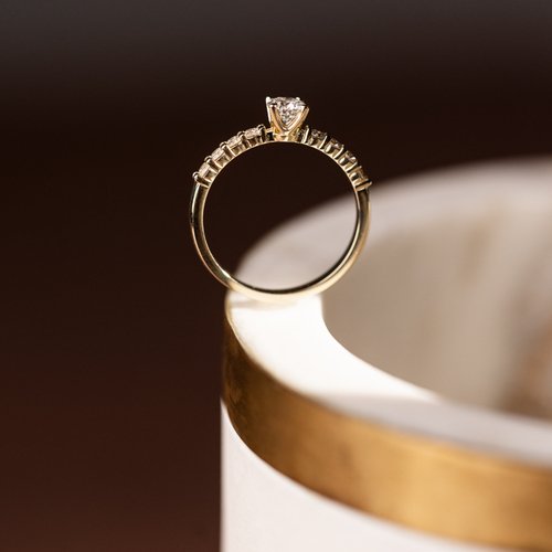 Luxusní prsten zdobí dominantní briliant v korunce a osm výrazných briliantů na obroučce. Dohromady tvoří skvostný třpytivý celek.
