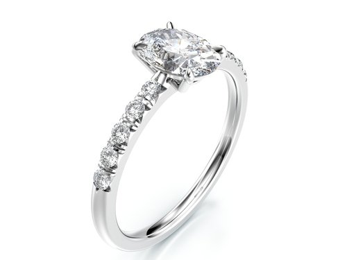 Oválný laboratorní diamant dominuje tomuto luxusnímu zásnubnímu prstenu. Třpyt diamantu v korunce zdůrazňují i jemné brilianty, kterými je poseta obroučka.