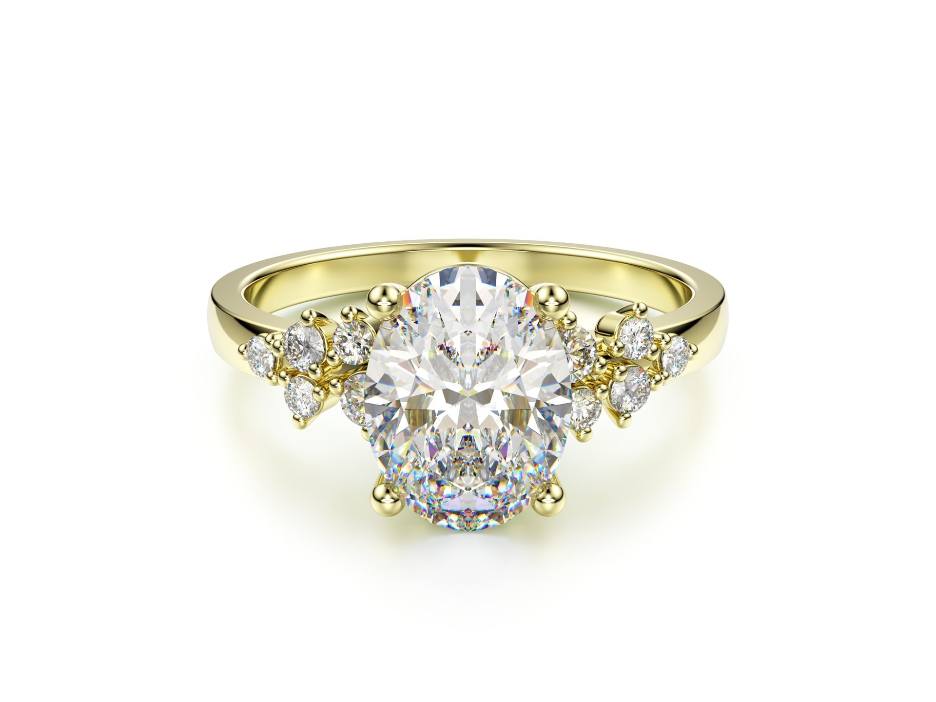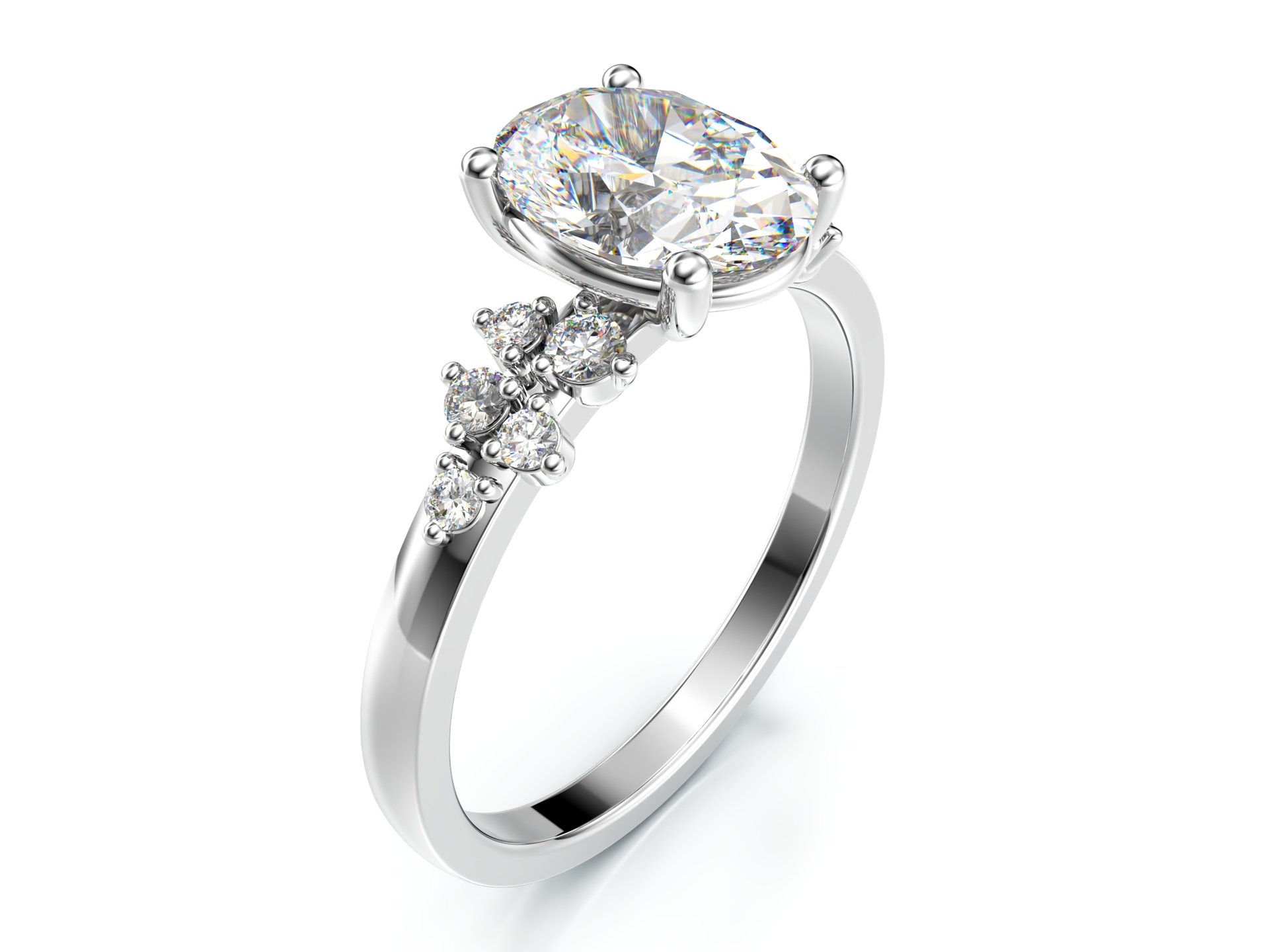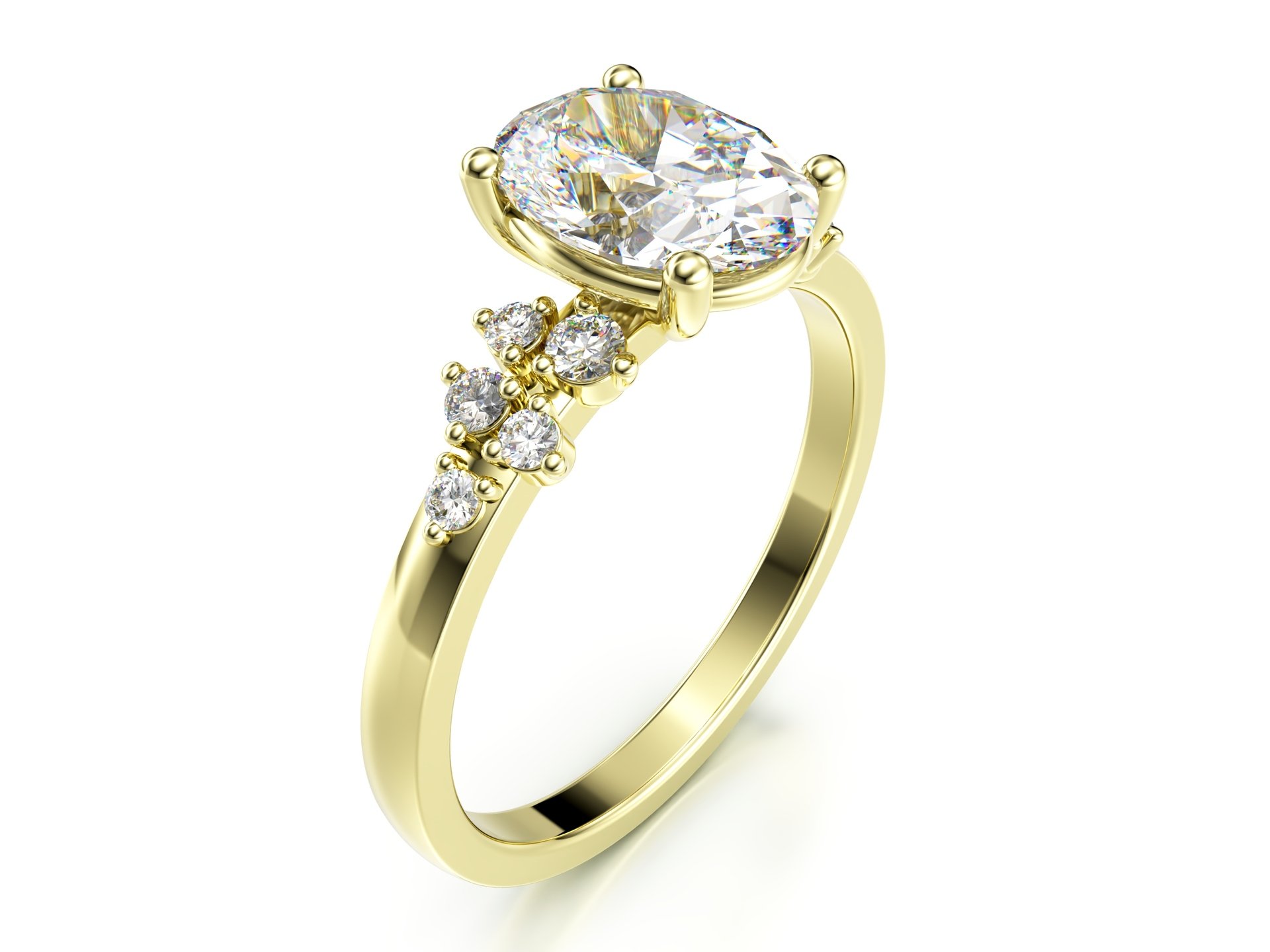 Dominantou tohoto výjimečného zásnubního prstenu je centrální diamant oválného brusu. Obklopují ho různě velké brilianty, díky nimž je šperk tak zajímavý.